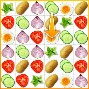 Bringe durch verschieben der einzelnen Reihen und Spalten mindestens 3 gleiche Zutaten nebeneinander oder untereinander um Punkte zu erhalten.
